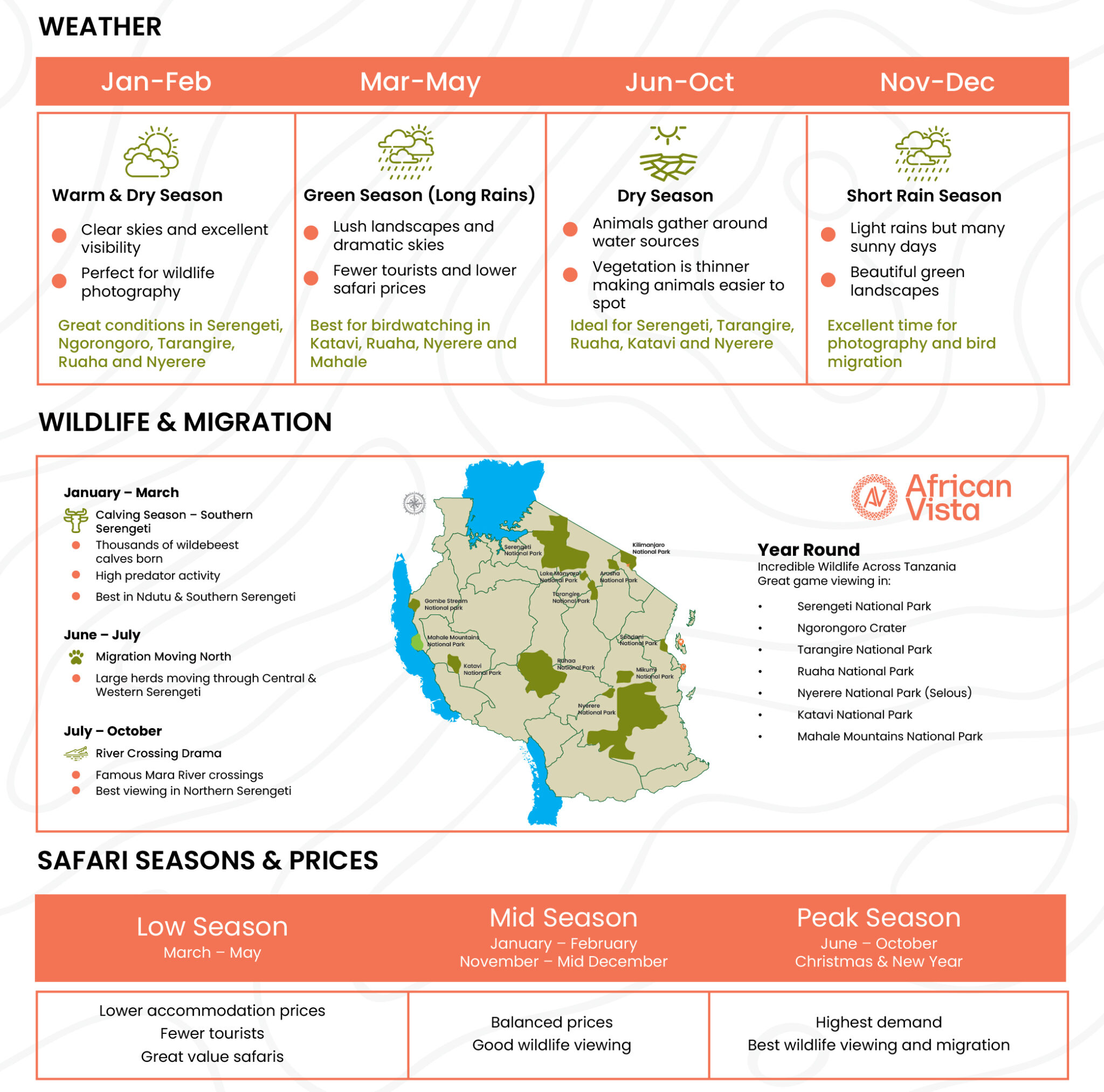 For those planning a Tanzania safari and Zanzibar beach holiday, the best months are June to October and December to February, when weather conditions are ideal for both wildlife viewing and coastal relaxation in Zanzibar. Whether you are planning a luxury safari, a budget tour, or a honeymoon, understanding Tanzania’s weather and seasons helps you choose the perfect time for an unforgettable African adventure.